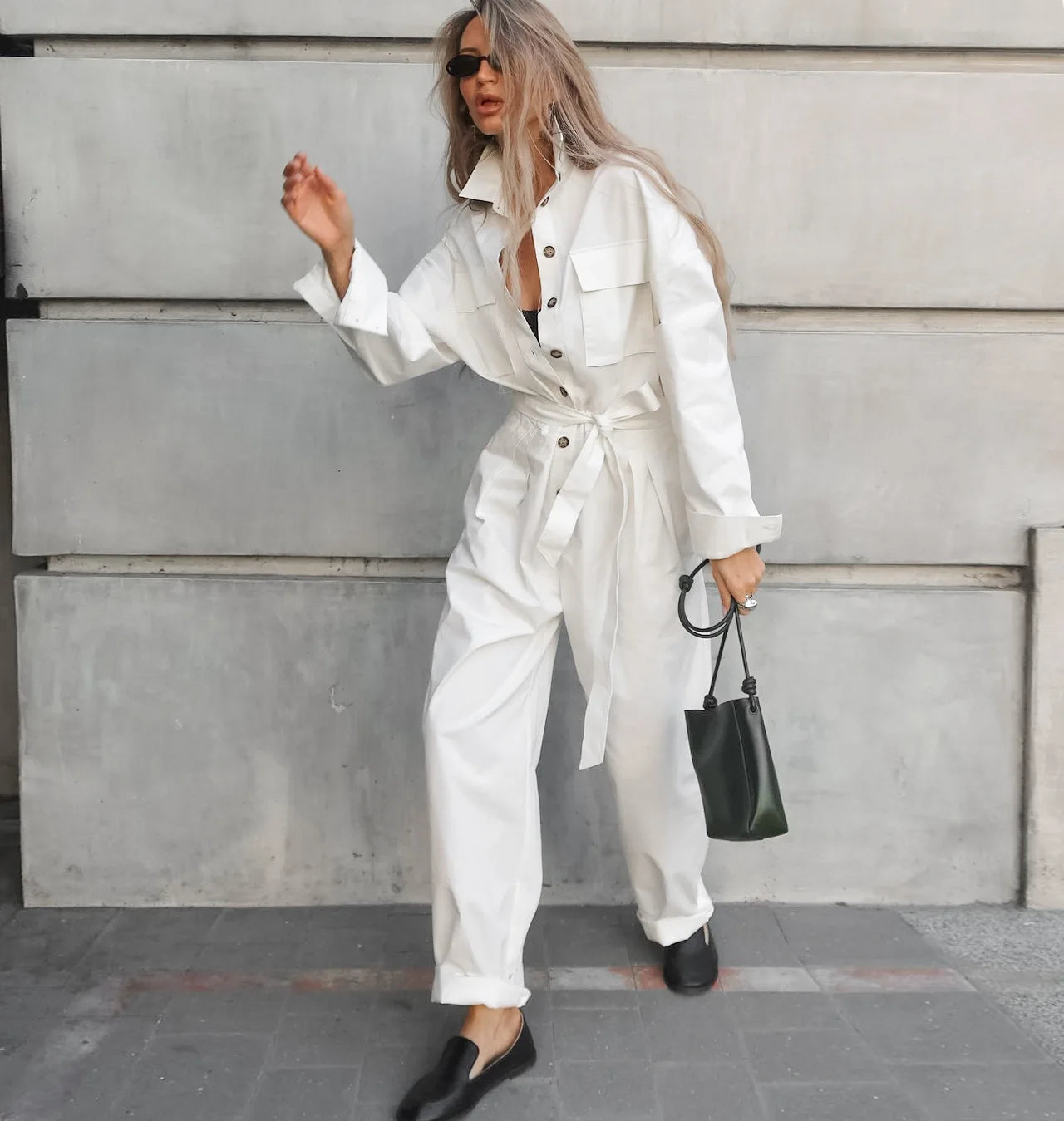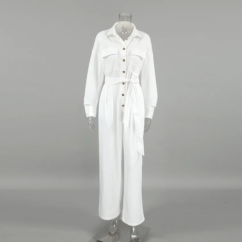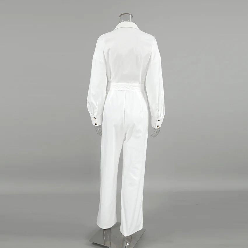 Elegant White Casual Rompers Long Sleeves Crape Lace-Up One-Piece Ladies Office Ladies Pockets 2024 Lapel Jumpsuits