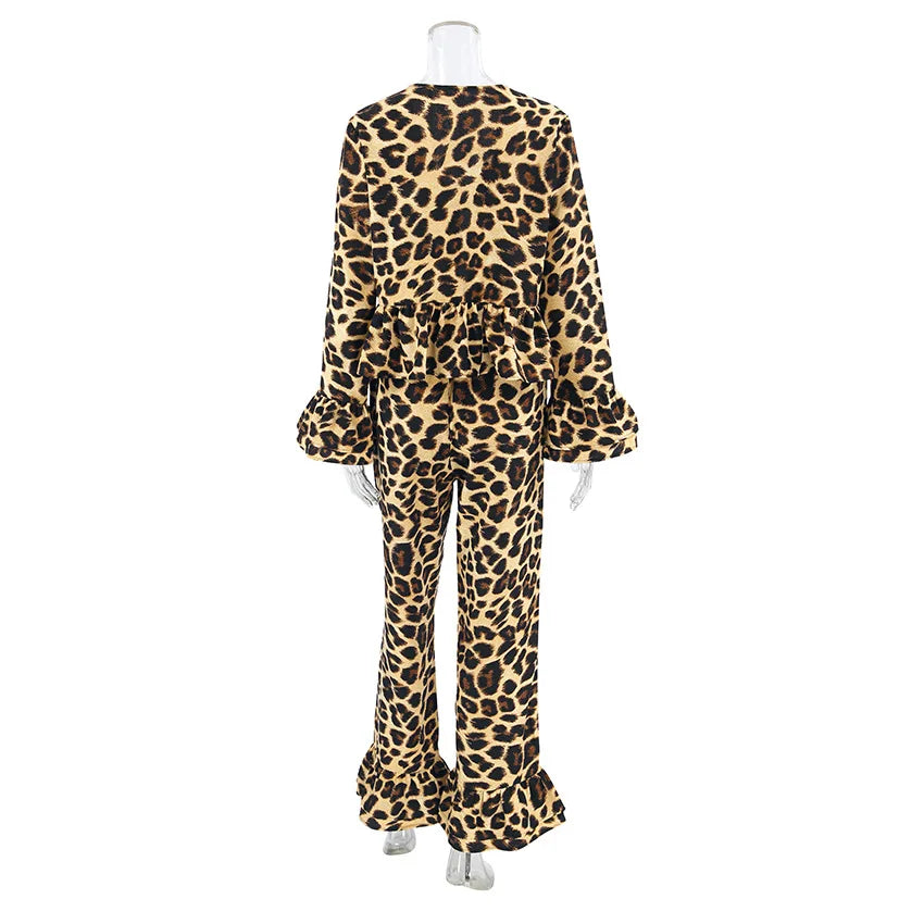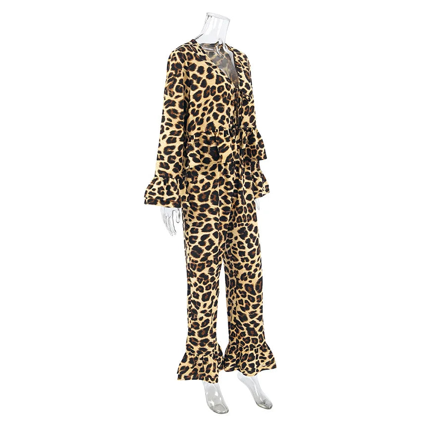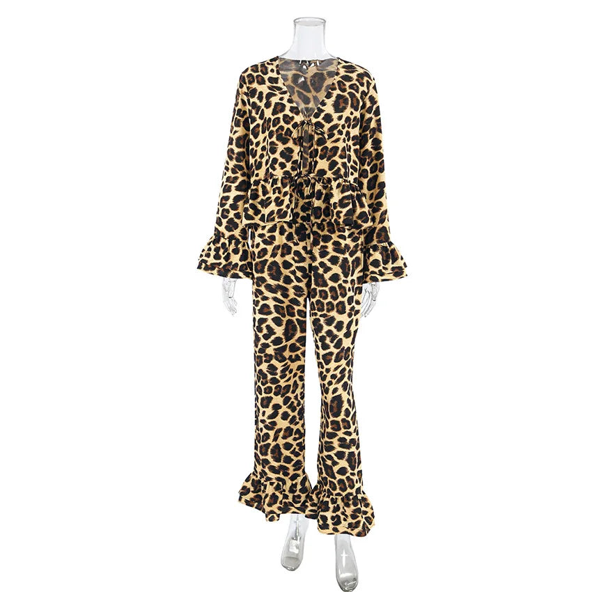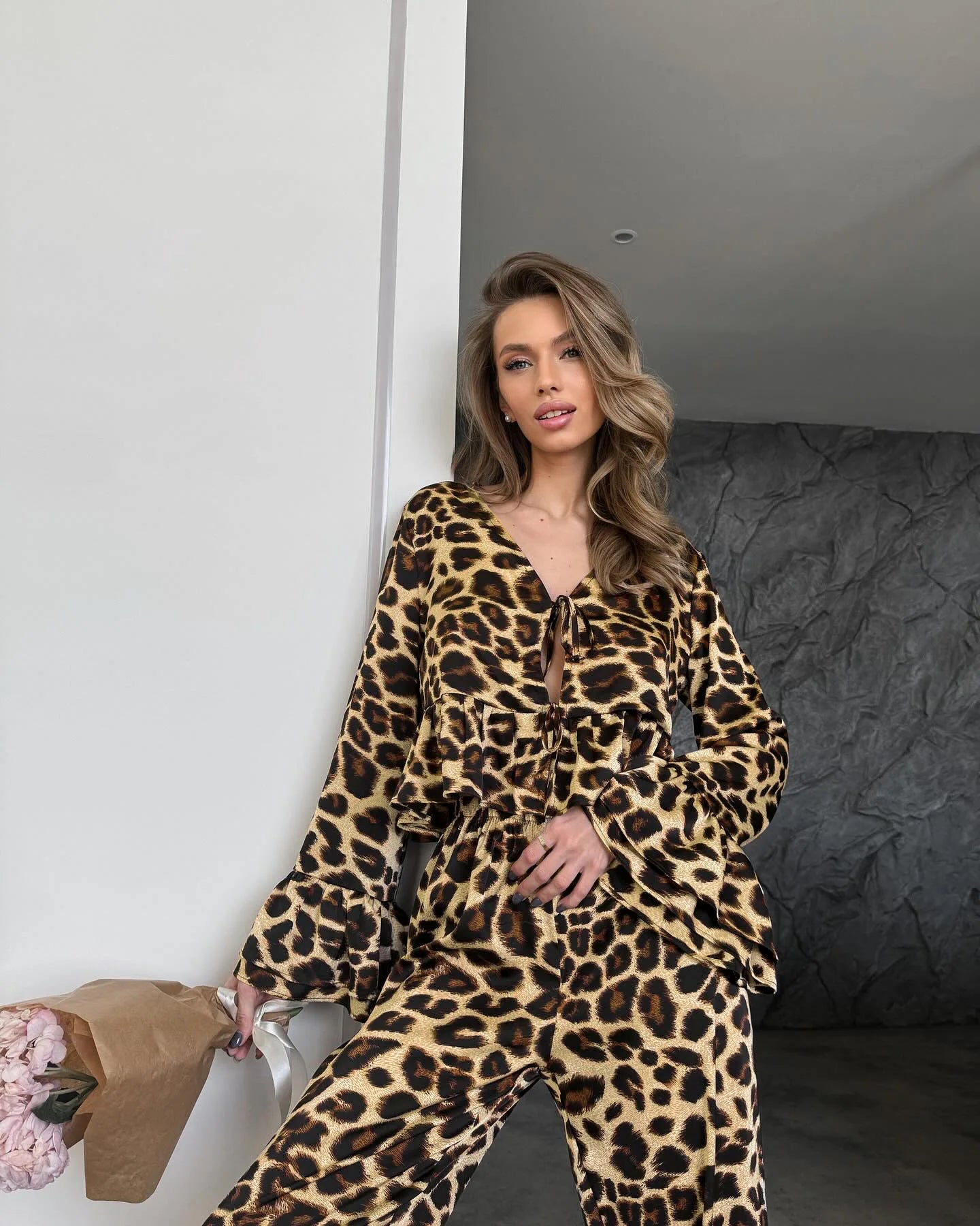 Leopard Pajamas For Women 2 Piece Sets Loose Long Sleeve V Neck Lace Up Sleepwear Female Casual Trouser Suits Autumn 2024